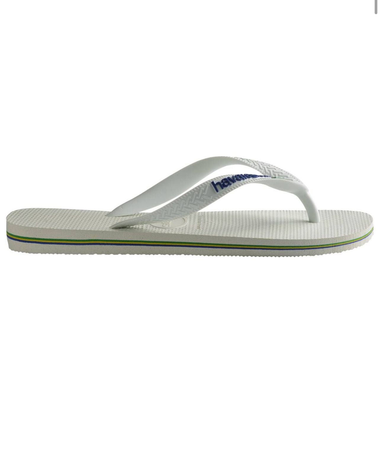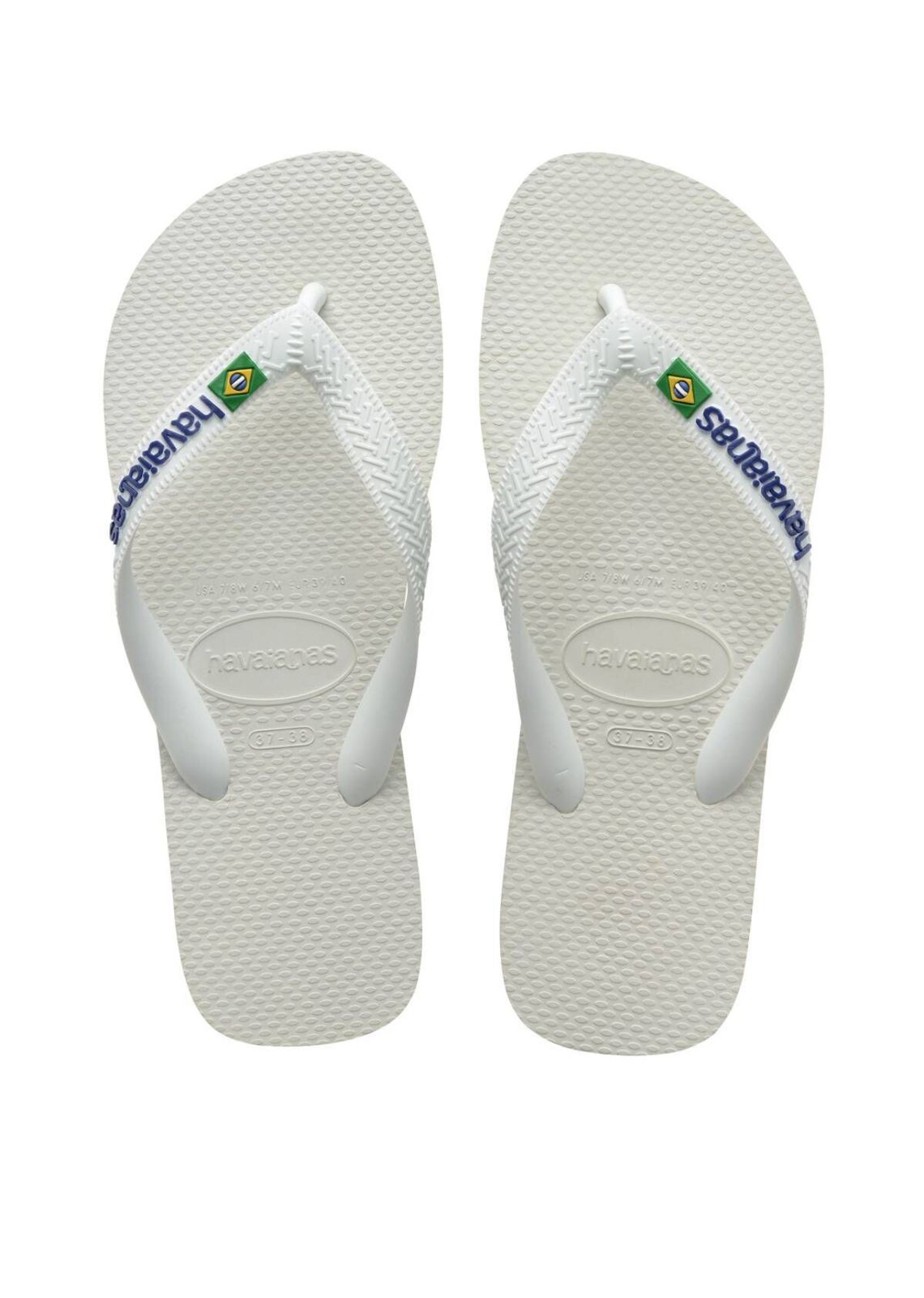 Na tira do chinelo, você encontra a bandeirinha do Brasil e o nome da marca em baixo relevo pop-up, com filetes coloridos nas laterais da sola — um sinal de identificação visual forte.