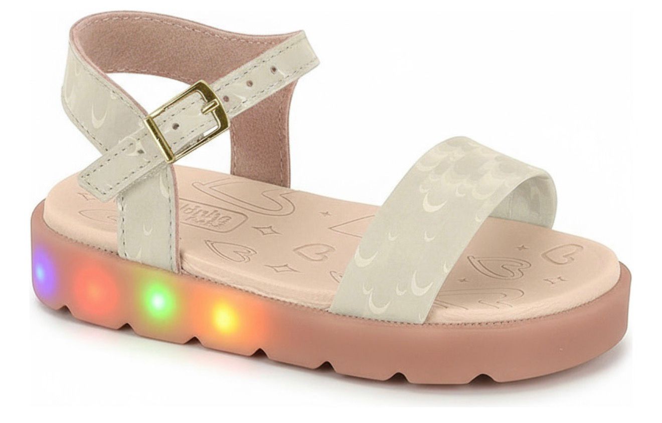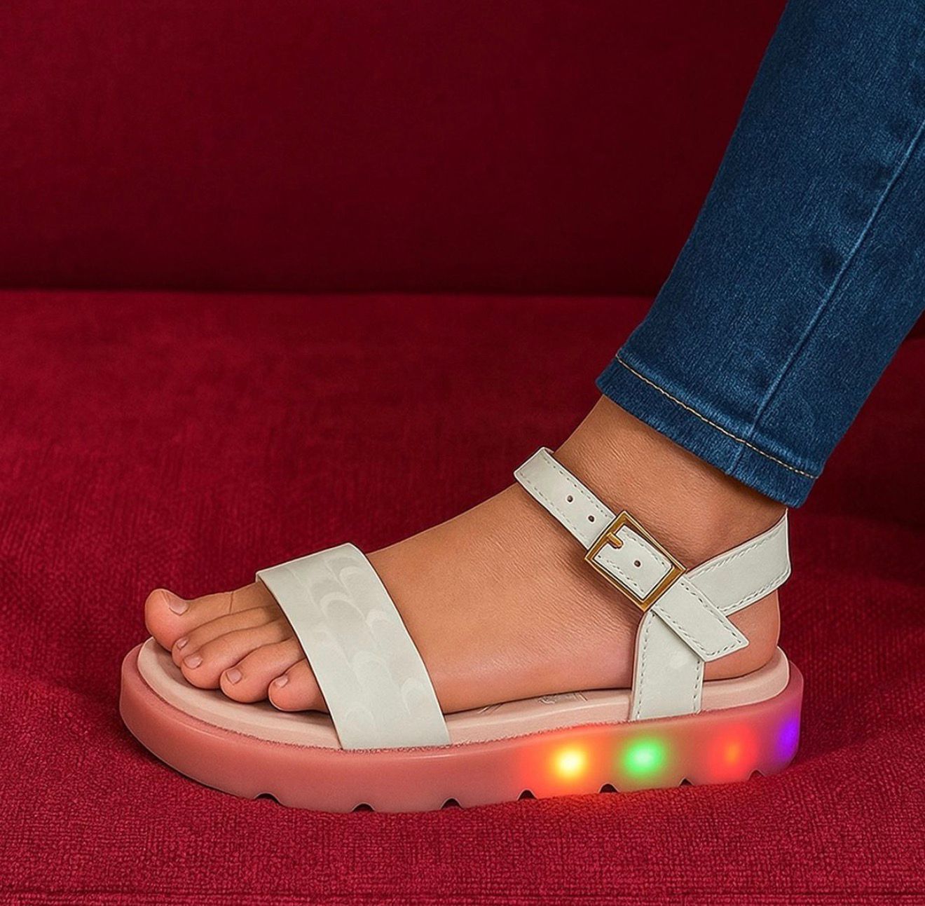 Sandália Infantil Menina Molekinha Branco Off com Luz — estilo, conforto e diversão para os pequenos! Ideal para meninas que adoram brilhar em qualquer ocasião, essa sandália conta com luzes coloridas que acendem a cada passo, tornando cada movimento especial e cheio de alegria. O design em branco off com acabamento delicado deixa o visual versátil e moderno, perfeito para combinar com diferentes looks de verão.